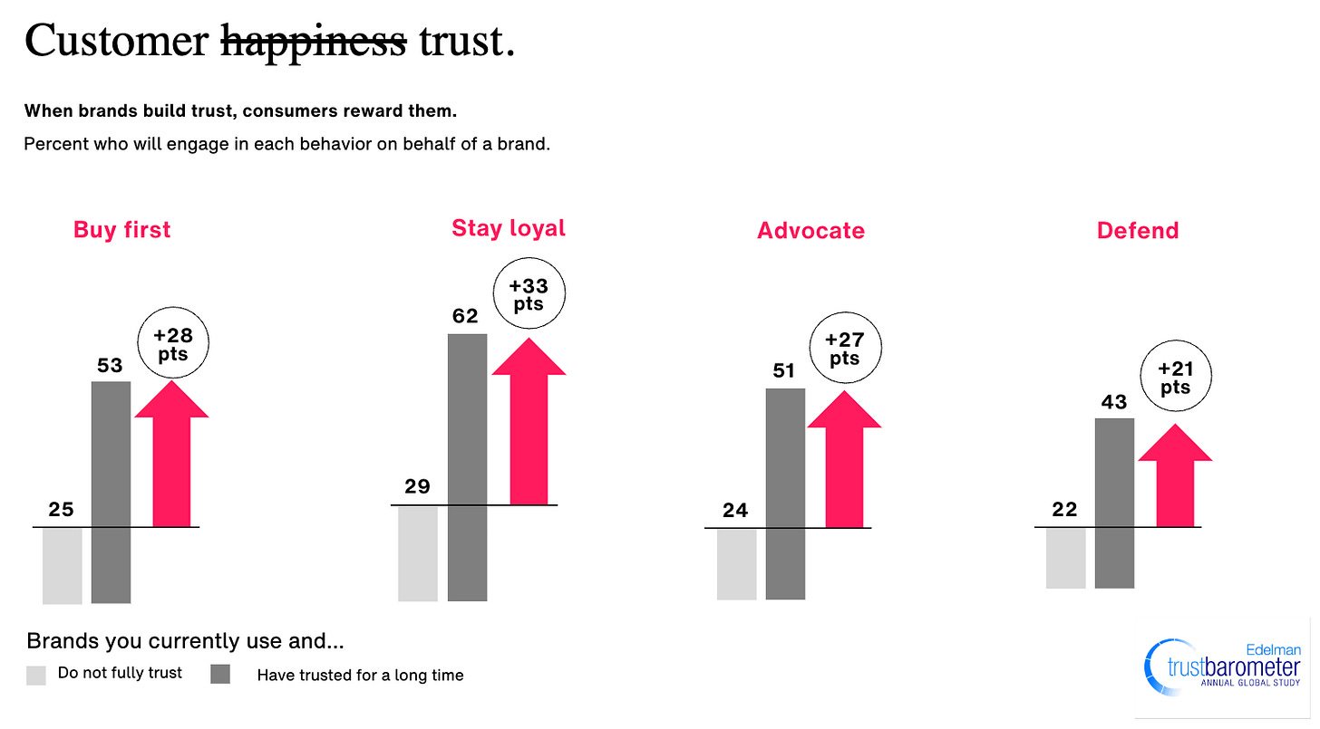 Consider this data from the Edelman Trust Barometer, which demonstrates the value of consumer trust in driving commercial success. Consumers report that for brands they’ve trusted for a long time, they are far more likely to buy first from, stay loyal to, advocate for, and importantly, defend the brand (when there is inevitable strife).